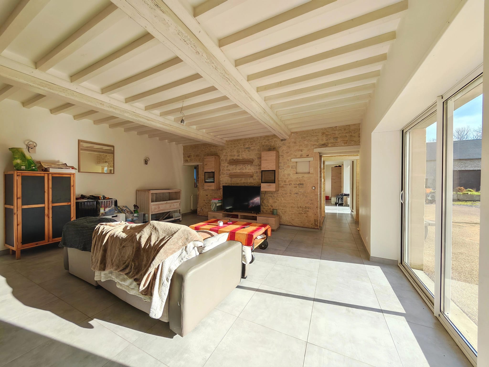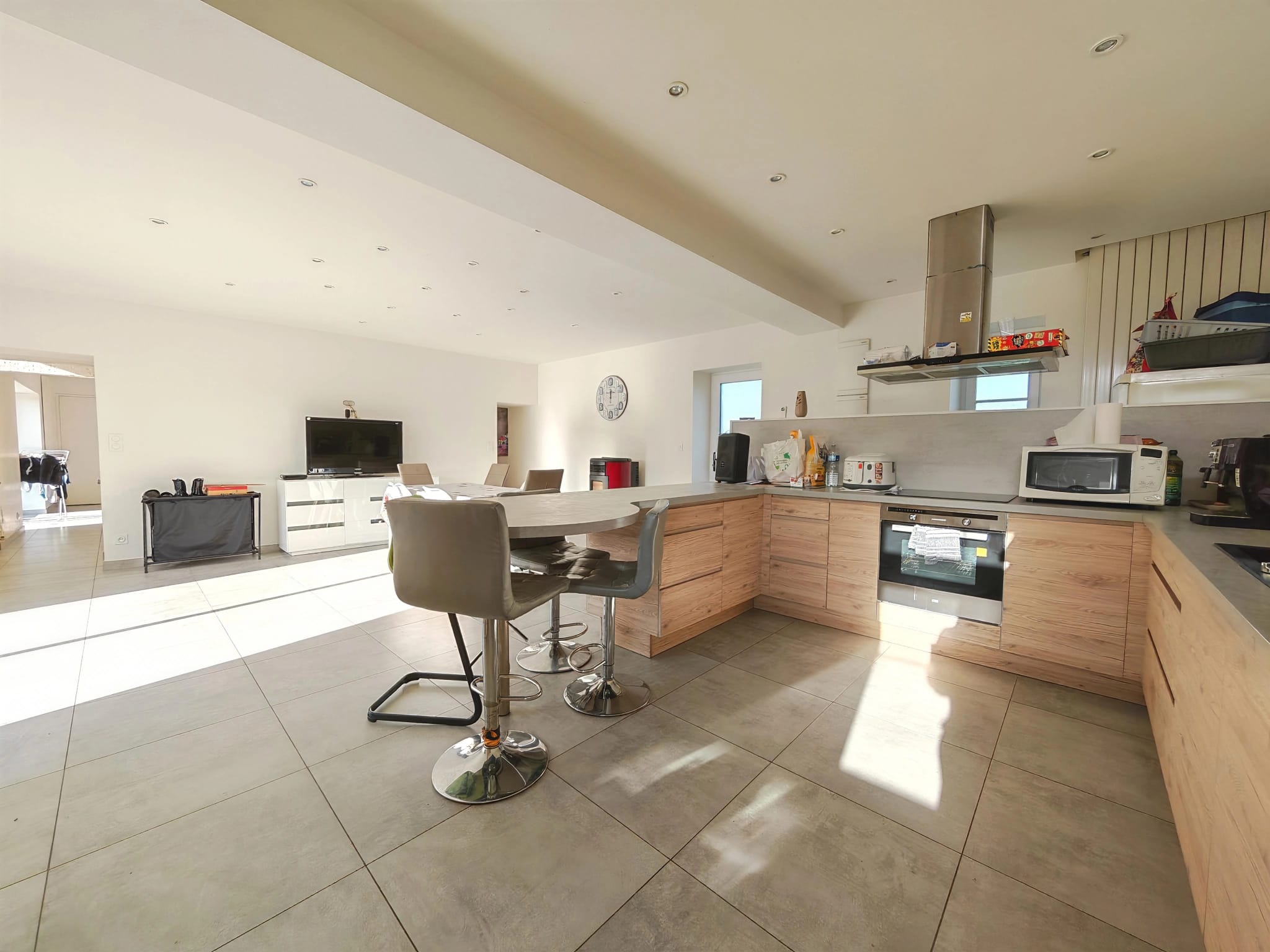 La maison principale avec ses 5 pièces pour environ 140 m2 habitable, offre un vaste espace de vie d’environ 70 m², comprenant une cuisine ouverte, aménagée et équipée, idéal pour recevoir